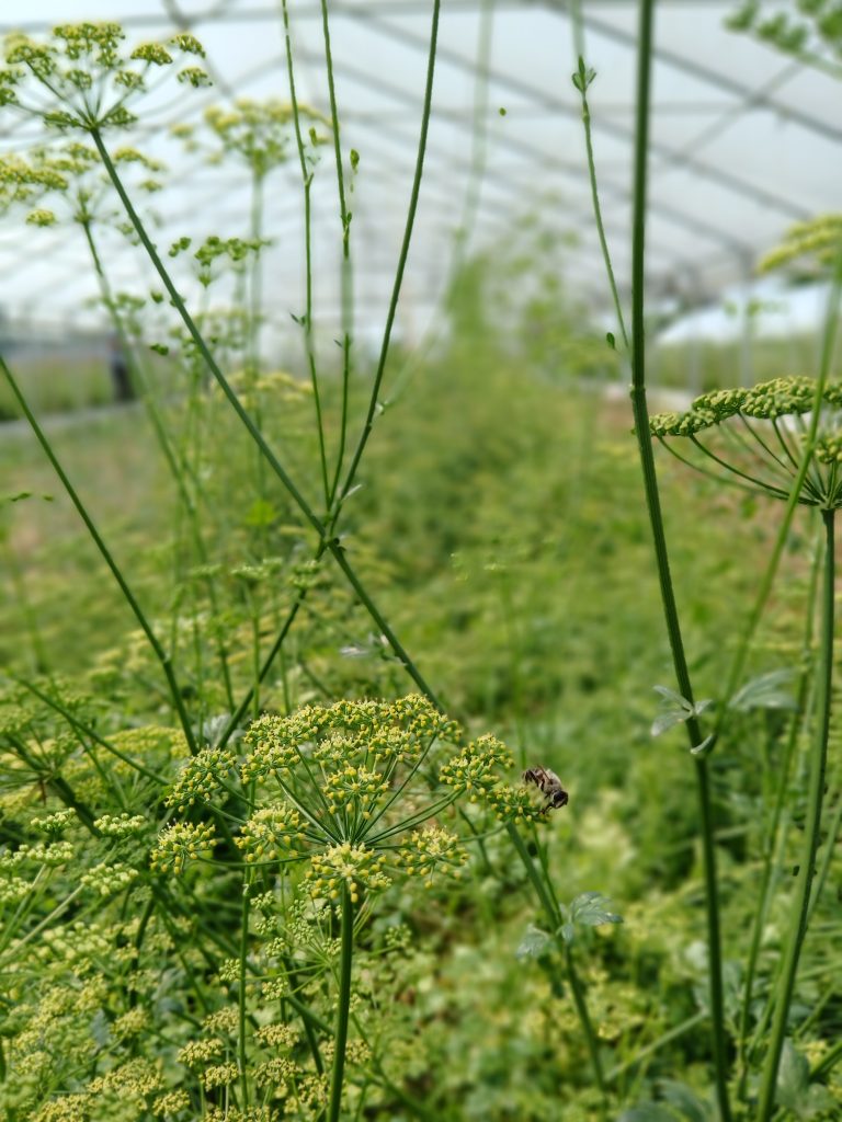 Es ist die gute alte Petersilie (auf gut oberösterreichisch „da Bedasü“), die gerade in unserem Gewächshaus zur Samenvermehrung abblüht. Essen sollte man das Kraut jetzt nicht mehr, da der Gehalt am Giftstoff Apiol mit der Blüte immer höher wird.